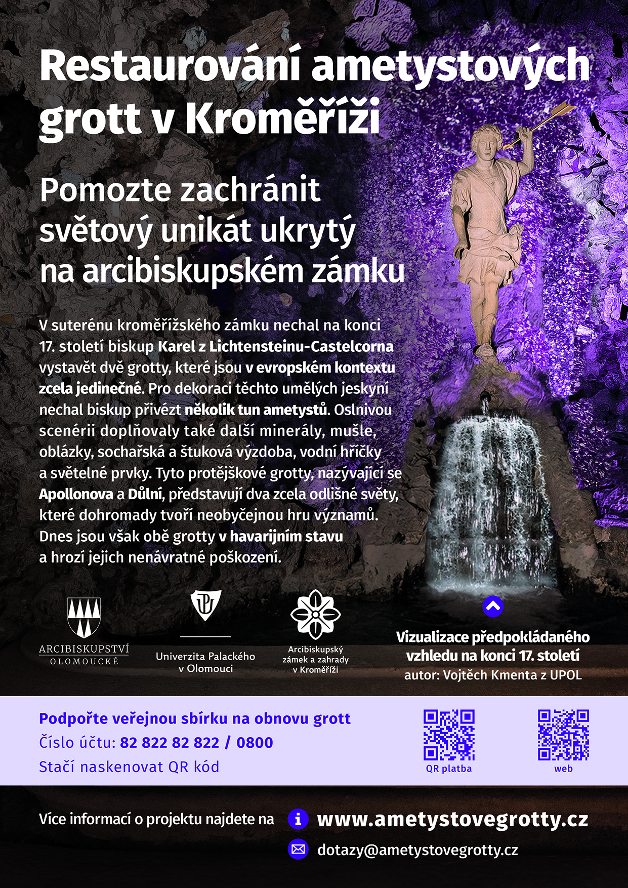 Účel sbírky: shromažďování finančních prostředků na záchranu – především konzervování a restaurování dvou barokních grott – umělých jeskyní – Arcibiskupského zámku v Kroměříži, které jsou evropsky unikátní nejen díky svému materiálovému složení a technologickým řešením, ale také pro svůj hluboký duchovní rozměr. V současné chvíli jsou obě grotty v havarijním stavu a jsou pro běžnou veřejnost přístupné jen v omezené míře. Cílem je grotty konzervovat / restaurovat a zachovat je tak pro budoucí generace. Finanční prostředky z veřejné sbírky budou využity na všechny zásahy spojené s konzervováním grott (lešení, materiálové a technologické průzkumy, rozbory odebraných vzorků, restaurátorské zásahy, zahraniční konzultace, …apod.), ale také pro medializaci a prezentaci dané problematiky a případně další možné aktivity s vazbou na objekty grott.