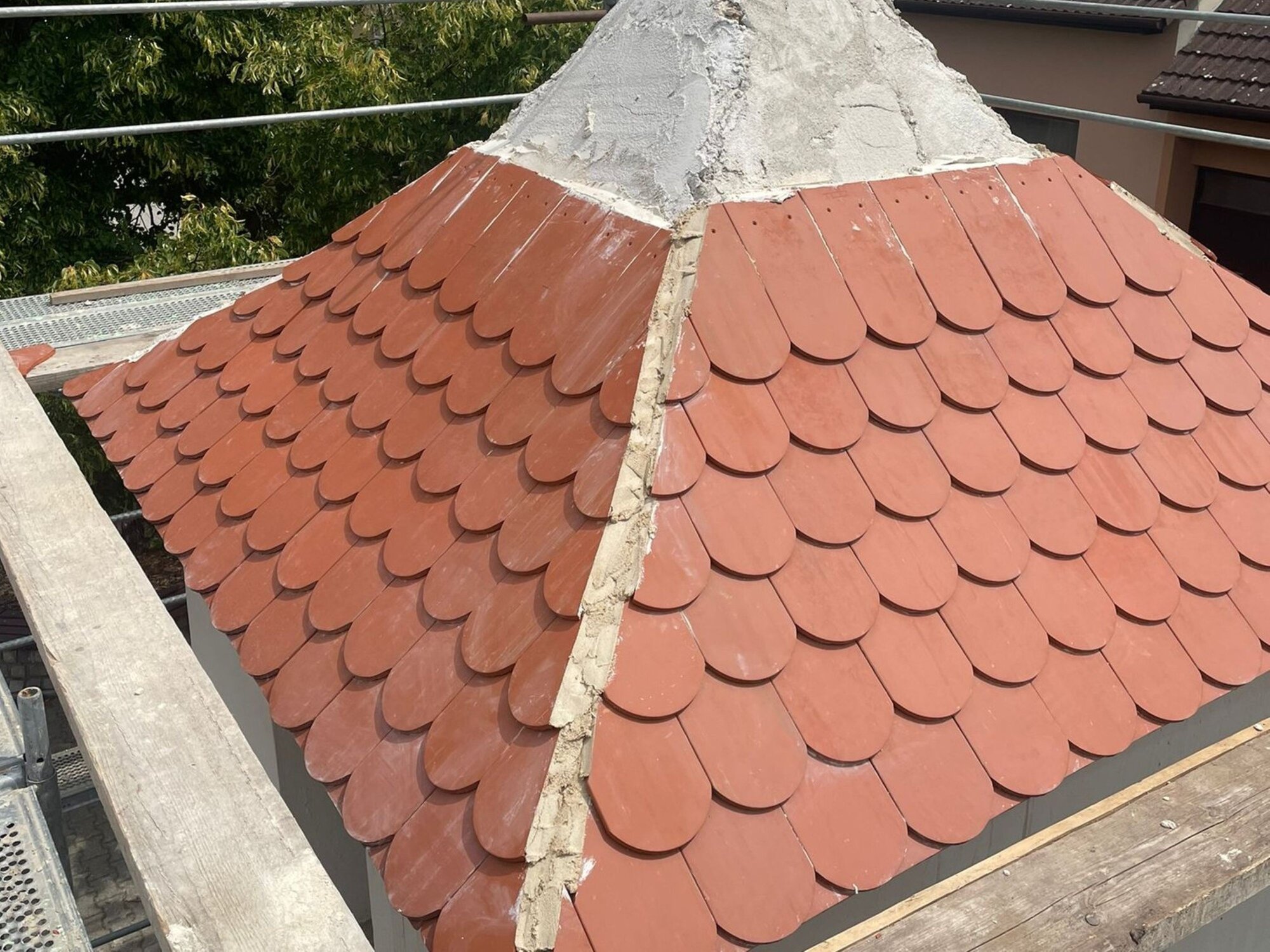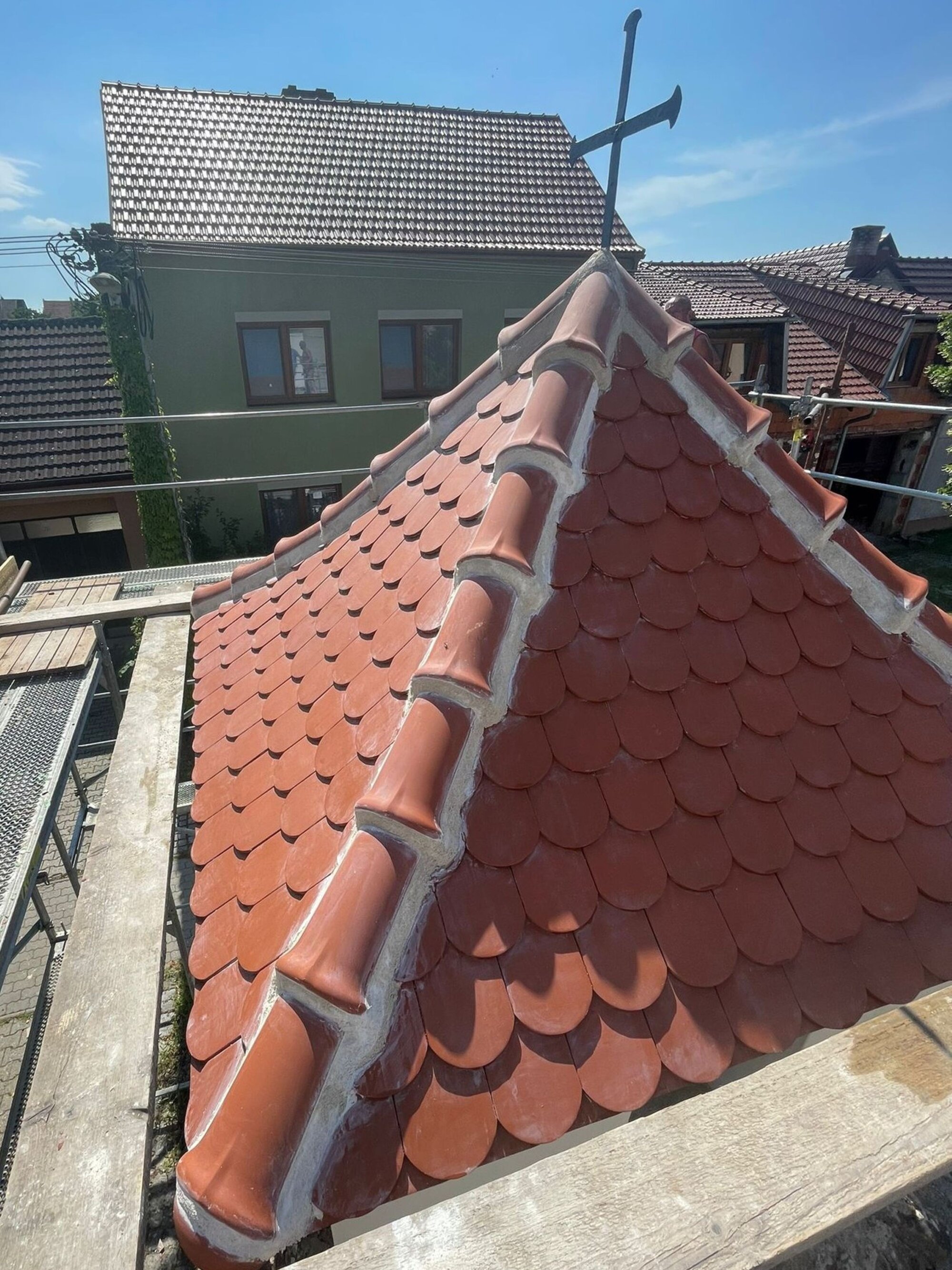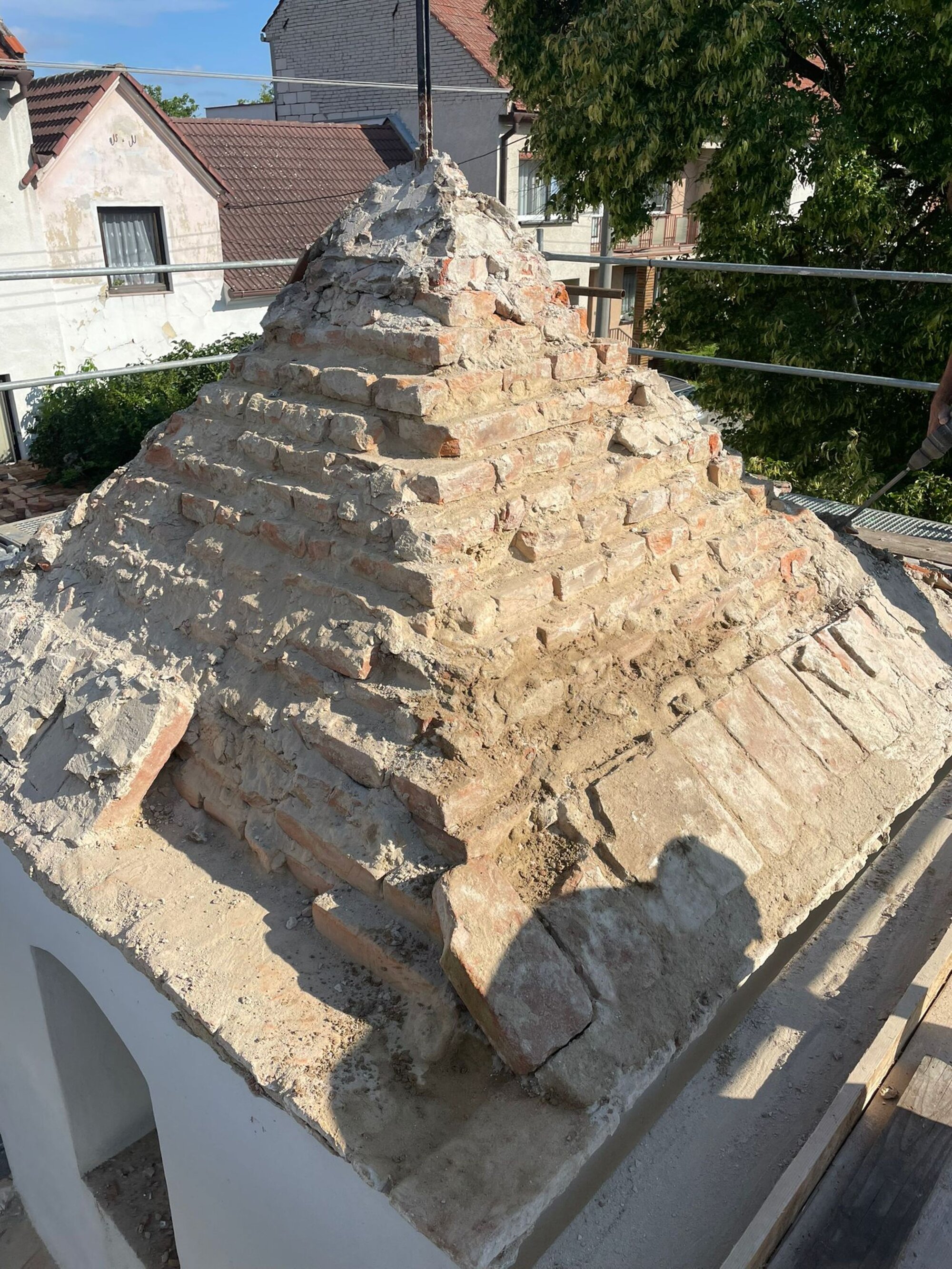 Podle jeho slov se při demontáži zjistilo, že konstrukce střechy vyzděná z cihel a dotvarovaná dozdívkami z malty, kousků keramických střepů a cihel je úplně destruovaná. „Musela se proto očistit až na zdravé jádro. Pak se provedla dozdívka z cihel a vytvořil se tvar střechy dle původního z malty a střepů. Až potom mohla následovat pokládka krytiny Bobrovka režná Tondach do maltového lože a nároží rovněž do malty,“ upřesňuje Josef Šlahůnek.